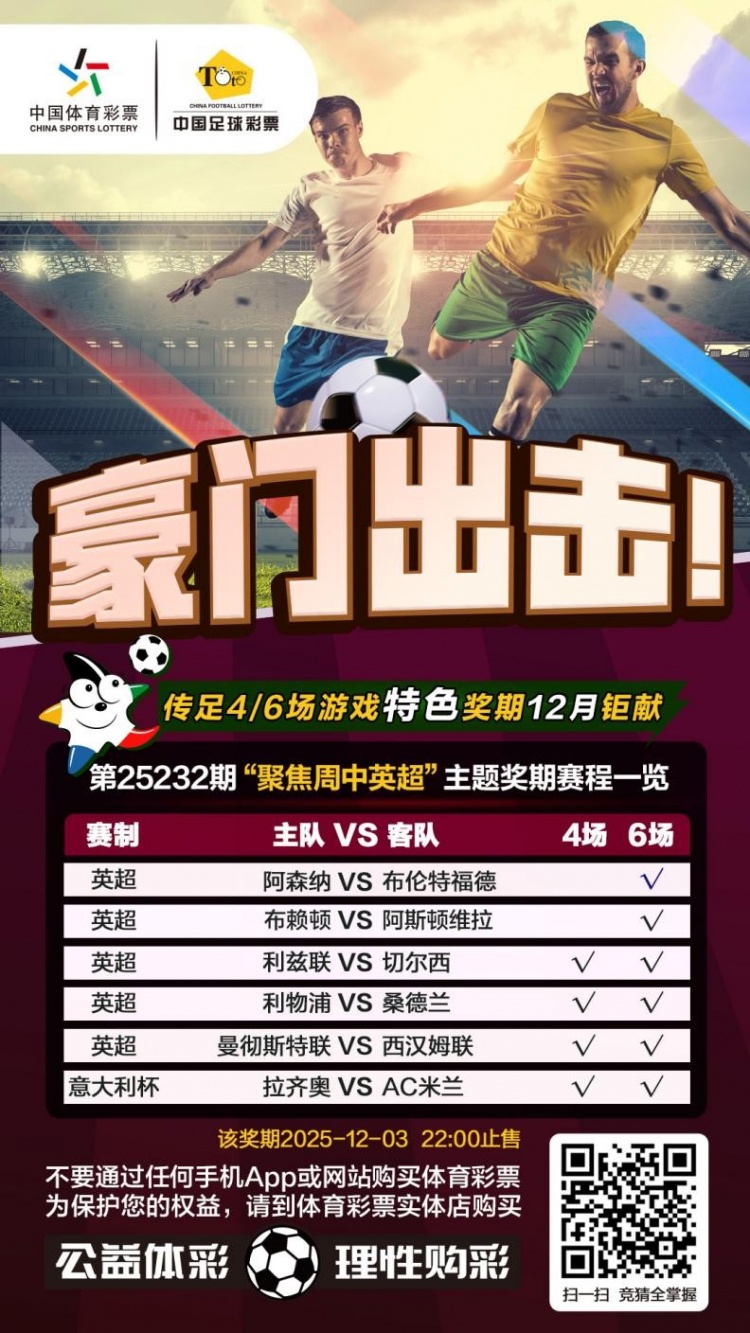 传足4/6场游戏特色奖期第25232期竞猜对象为周中英超和意大利杯1/8决赛,具体对阵:英超的阿森纳VS布伦特福德、布赖顿VS阿斯顿维拉、利兹联VS切尔西、利物浦VS桑德兰、曼彻斯特联VS西汉姆联,意大利杯的拉齐奥VSAC米兰。