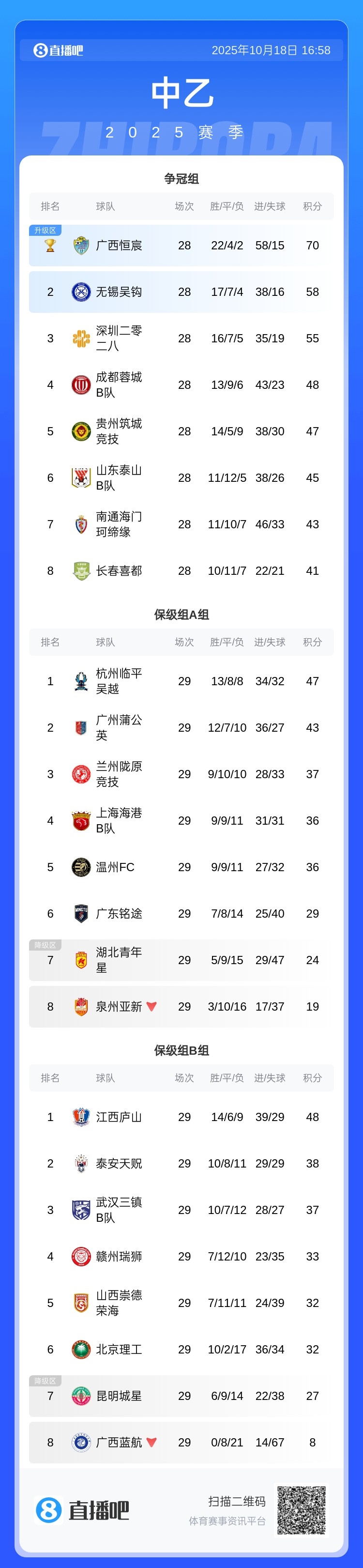 中乙保级组第29轮综述:湖北青年星、昆明城星输