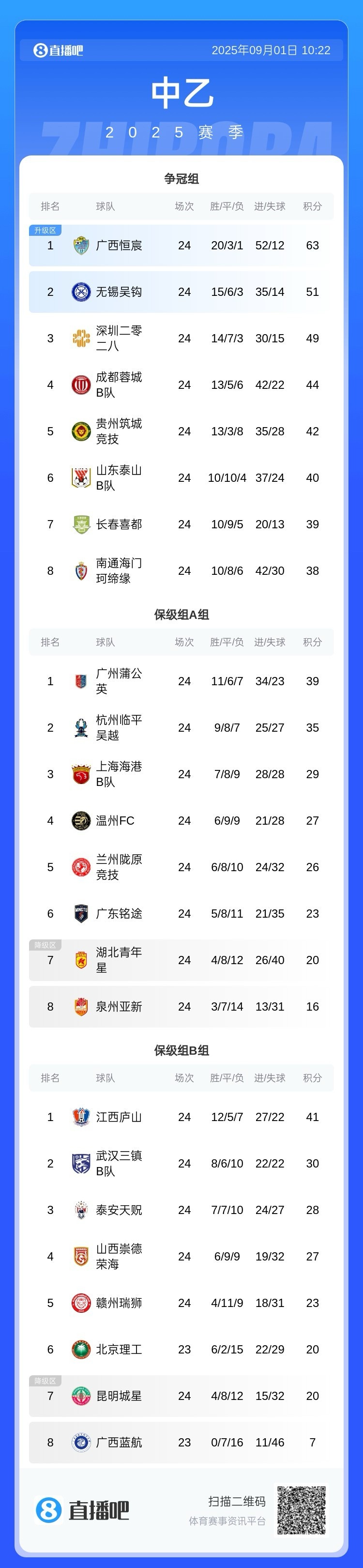 足球比分网9月1日讯 中乙保级组结束第24轮争夺,海港B队2-2战平广州蒲公英,武汉三镇B队0-1不敌北京理工,广西蓝航1-1泰安天贶仍难求一胜。 附中乙保级组第24轮赛果: 上海海港B队2-2广州蒲公英(进球信息:74’ 张俊杰、90+2’ 张慧宇;18’ 梁正、26’ 杨悠仙) 泰安天贶1-1广西蓝航(进球信息:90+10’ 姚道刚;3’ 南云齐) 赣州瑞狮0-1江西庐山(进球信息:90+2’ 孙越) 广东铭途1-0杭州临平吴越(进球信息:48’ 何嘉林点球) 昆明城星0-0山西崇德荣海 湖北青年星0-0泉州亚新 北京理工1-0武汉三镇B队(进球信息:22’ 胡嘉祺) 温州FC0-0兰州陇原竞技