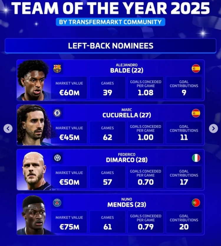 足球比分网12月3日讯 《转会市场》评选2025年最佳左后卫,并列出了4人候选同时对比了他们的数据: 巴尔德(巴萨,22岁,西班牙):身价6000万欧,39场,场均丢1.08球,直接参与9球 库库雷利亚(切尔西,27岁,西班牙):身价4500万欧,62场,场均丢1.00球,直接参与11球 迪马尔科(国米,28岁,意大利):身价5000万欧,57场,场均丢0.70球,直接参与17球 努诺·门德斯(巴黎,23岁,葡萄牙):身价7500万欧,61场,场均丢0.79球,直接参与20球 |