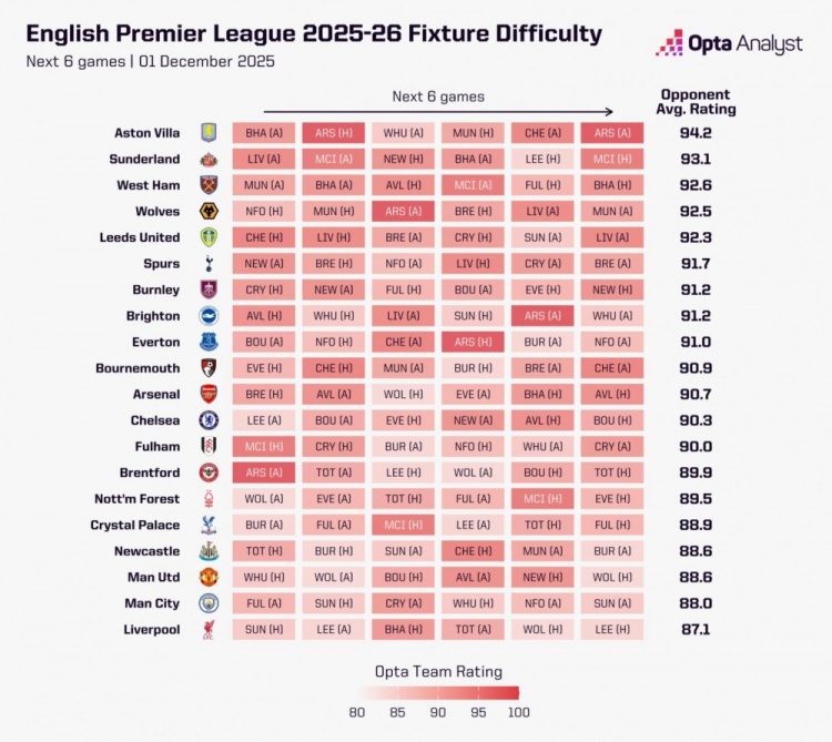 足球比分网12月2日讯 opta分析了英超各队未来6轮的赛程难易程度,维拉赛程最为艰难,利物浦最容易。曼城第二容易,曼联并列第三容易。 英超各队未来6轮的赛程难易程度: 1、维拉:94.2分(布莱顿、阿森纳、西汉姆联、曼联、切尔西、阿森纳) 2、桑德兰:93.1分 3、西汉姆联:92.6分 4、狼队:92.5分 5、利兹联:92.3分 6、热刺:91.7分(纽卡、布伦特福德、诺丁汉森林、利物浦、水晶宫、布伦特福德) 7、伯恩利:91.2分 布莱顿:91.2分 9、埃弗顿:91分 10、伯恩茅斯:90.9分 11、阿森纳:90.7分(布伦特福德、维拉、狼队、埃弗顿、布莱顿、维拉) 12、切尔西:90.3分(利兹联、伯恩茅斯、埃弗顿、纽卡、维拉、伯恩茅斯) 13、富勒姆:90分 14、布伦特福德:89.9分 15、诺丁汉森林:89.5分 16、水晶宫:88.9分 17、纽卡:88.6分 曼联:88.6分(西汉姆联、狼队、伯恩茅斯、维拉、纽卡、狼队) 19、曼城:88分(富勒姆、桑德兰、水晶宫、西汉姆联、诺丁汉森林、桑德兰) 20、利物浦:87.1分(桑德兰、利兹联、布莱顿、热刺、狼队、利兹联)