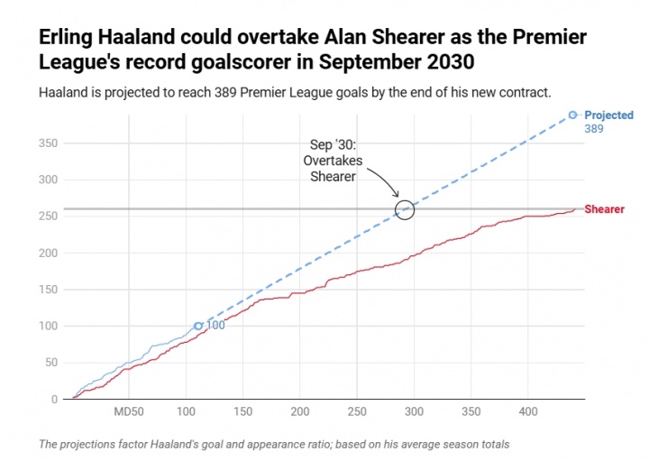 足球比分网12月03日讯 英超第14轮,曼城客场5-4险胜富勒姆,25岁的哈兰德成为英超历史攻入100球最快(111场)的射手,比希勒快了13场达成。 现在的问题是,哈兰德何时能打破希勒保持的英超进球纪录(260球)?希勒的这项纪录自2006年4月打入最后一球之后,一直无人能破。 天空体育数据分析,如果哈兰德能保持健康状态,他在伊蒂哈德的三个多赛季中只缺席了14场联赛,那么他将在2030年9月,也就是他30岁生日后不久,将超越希勒。 如果哈兰德能保持目前的良好状态,直到他九年半合同结束,他最终将达到389球——比希勒多129球。 |