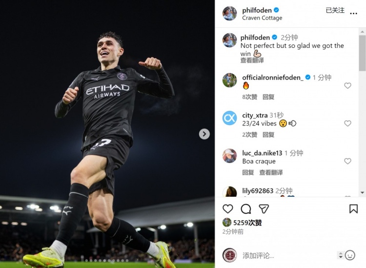 双响!福登社媒庆祝胜利:比赛并不完美,但很