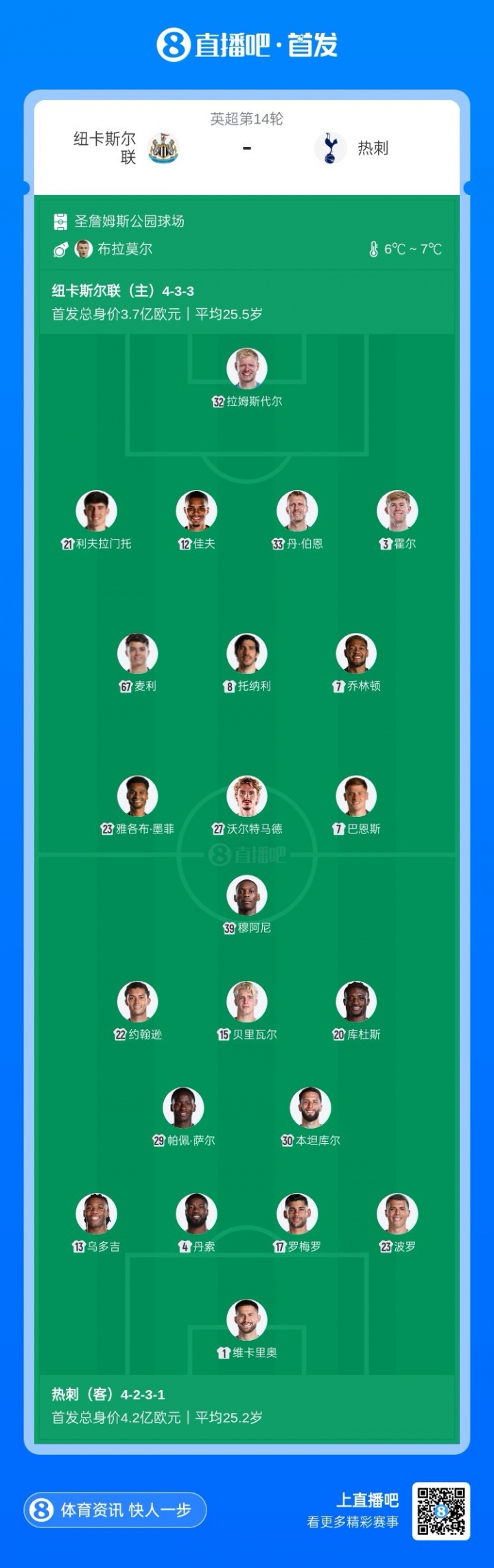 纽卡vs热刺首发:沃尔特马德PK穆阿尼,乔林顿、