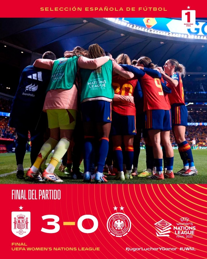 足球比分网12月03日讯 女足欧国联决赛,西班牙女足首回合0-0,次回合3-0战胜德国女足,卫冕女足欧国联冠军!西班牙女足赢得第二座欧国联冠军奖杯! 迄今为止已举行的两届赛事中,西班牙女足连续夺冠,从而在2023年女足世界杯之后,收获了第三个国际大赛冠军。 她们在总共18场小组赛和淘汰赛中取得了15场胜利,在此期间攻入58球,仅失17球。 本场比赛,克劳迪娅·皮娜(梅开二度),维姬·洛佩兹锁定胜局(3-0),维持了西班牙在该项赛事中的霸主地位。