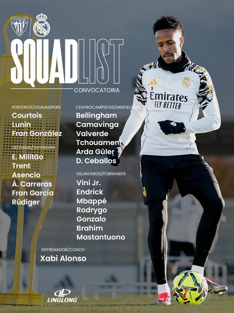 足球比分网12月3日讯 北京时间明天凌晨2点,西甲第19轮皇马将客场对阵毕尔巴鄂竞技,皇马公布了此役球队大名单。 皇马客战毕巴名单: 门将:库尔图瓦、卢宁、弗兰·冈萨雷斯 后卫:米利唐、阿诺德、劳尔·阿森西奥、卡雷拉斯、弗兰·加西亚、吕迪格 中场:贝林厄姆、卡马文加、巴尔韦德、琼阿梅尼、居莱尔、塞巴略斯 前锋:维尼修斯、恩德里克、姆巴佩、罗德里戈、贡萨洛·加西亚、布拉欣·迪亚斯、马斯坦托诺