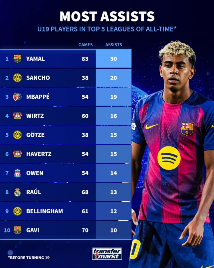 足球比分网12月2日讯 德国转会市场统计了U19球员在五大联赛中的助攻次数,并列出榜单,亚马尔30助居首,桑乔20助次席。 五大联赛历史U19球员助攻排名(19岁之前助攻): 亚马尔——83场30助 桑乔——38场20助 姆巴佩——54场19助 维尔茨——60场16助 格策——38场15助 哈弗茨——54场15助 欧文——54场14助 劳尔——68场13助 贝林厄姆——61场12助 加维——70场10助