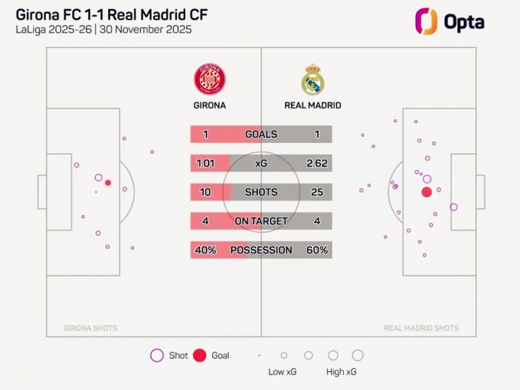 对阵赫罗纳,皇马全场25次射门只换来1粒进球。姆巴佩打进1球所需时间为90分钟,皇马缺少能够分担其进球压力的二号射手。