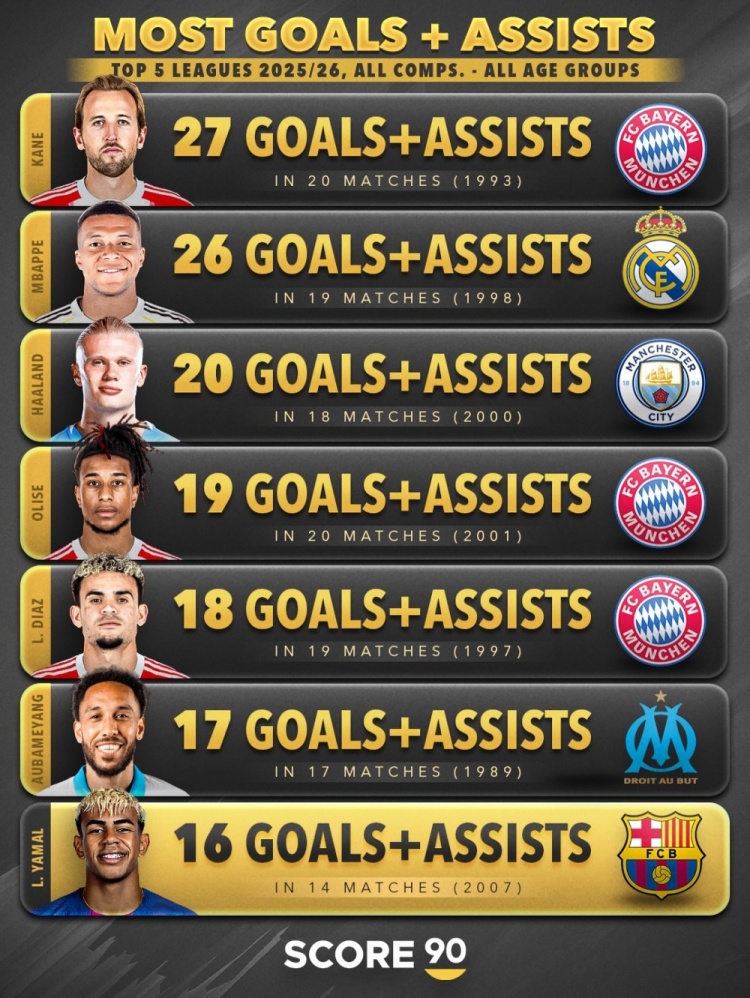 足球比分网12月2日讯 Score90统计了本赛季五大联赛球员参与进球数量,并列出榜单,凯恩27球居首。 本赛季五大联赛球员参与进球榜(所有赛事): 凯恩(拜仁)——20场27球 姆巴佩(皇马)——19场26球 哈兰德(曼城)——18场20球 奥利塞(拜仁)——20场19球 迪亚斯(拜仁)——19场18球 奥巴梅扬(马赛)——17场17球 亚马尔(巴萨)——14场16球