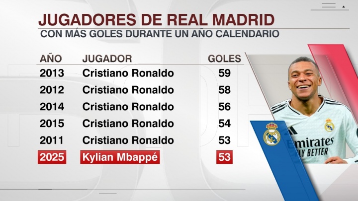 足球比分网12月01日讯 西甲第14轮,皇马1-1赫罗纳。 姆巴佩本场比赛点射破门,今年姆巴佩已经代表皇马攻入了53球。追平了2011年的C罗。 具体如下: 2013年,C罗59球 2012年,C罗58球 2014年,C罗56球 2015年,C罗54球 2011年,C罗53球 2025年,姆巴佩53球