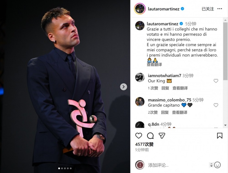 入选最佳阵容!劳塔罗社媒:感谢队友,没有你