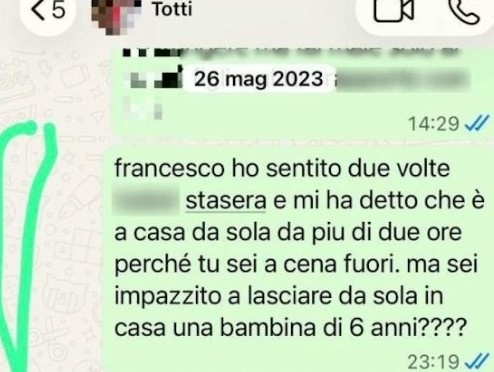 足球比分网12月2日讯 近日,《米兰体育报》曝光了托蒂与其前妻布莱西的对话信息,布莱西指责托蒂与新伴侣诺埃米·博基外出就餐时将他们6岁的孩子单独留在家中。 2023年,这位前罗马队长和他的新伴侣诺埃米·博基外出就餐时,将伊莎贝尔(托蒂与布莱西的女儿)以及博基的两个未成年孩子独自留在家中。尽管检察官已要求归档此案,但伊利莉·布莱西通过她的律师表示,司法程序可能还会继续。 伊利莉·布莱西的律师在听证会上提出了请求,该听证会旨在决定是否接受对托蒂和博基提出的归档请求。他指出:“托蒂和诺埃米·博基因为于2023年5月26日晚上外出就餐而将孩子们独自留在家中,应被指控遗弃未成年人。” 法官保留了对这些请求的意见,并未说明何时会做出决定。布莱西的律师可能会继续调查,包括听取托蒂的朋友维托·斯卡拉以及首先介入的警察的陈述。检察官仍然支持归档此案,声称连伊利莉·布莱西自己也不认为女儿处于危险之中。托蒂和诺埃米·博基的辩护律师也要求归档此案。 伊利莉·布莱西当时因工作原因身处法兰克福,当晚,在接到她母亲的电话后,她通过视频通话联系了伊莎贝尔,要求女儿展示家里的情况。随后,她试图联系前夫但未得到回应。