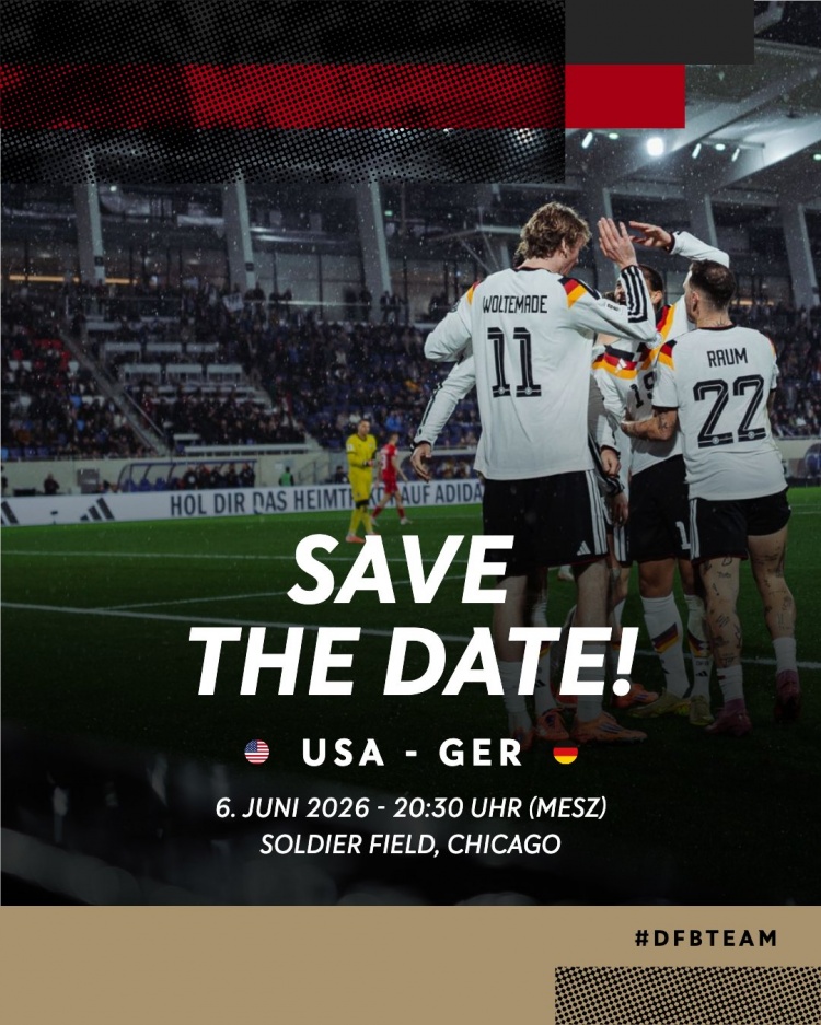 足球比分网12月3日讯 德国足协官方宣布,德国队将在世界杯之前的最后一场友谊赛中对阵美国队。 德国足协发布公告,确认德国将在世界杯之前的最后一场比赛中对阵美国,比赛开球时间为2026年6月6日20点30分,地点为芝加哥军人球场。 |
