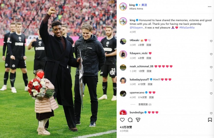 足球比分网12月1日讯 拜仁在本轮德甲3-1逆转圣保利,今夏转会离队的科曼在赛前接受了俱乐部为其安排的致敬仪式。 他也在今日通过社媒晒出现场照,并配文:“很荣幸能与大家分享这些回忆、胜利和美好时光。感谢拜仁慕尼黑昨天邀请我回来,我真的非常开心 |