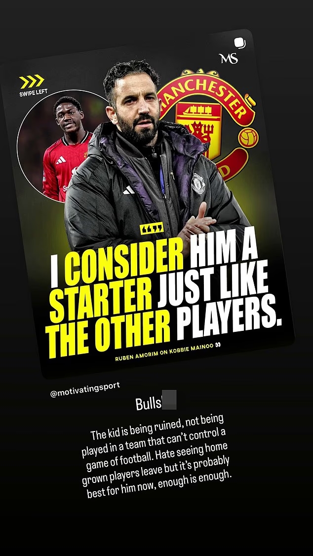 足球比分网12月05日讯 据《每日邮报》报道,前曼联传奇中场斯科尔斯在ins上发表了对梅努的看法,表示他在球队得不到机会,是时候离开了。 阿莫林此前谈及梅努时表示:“我把他和其他球员一样看作主力,我只是必须做出选择,而最终,选中的不是他。至于未来,我不知道。卡塞米罗之前也没怎么上场,后来就获得了机会。我只想要赢球,不在乎谁在场上。” 斯科尔斯在社媒上晒出阿莫林言论,并表示:“狗屁*(bulls***' ),这孩子正在被毁掉,在一支连球都控不住的球队里得不到出场机会。我讨厌看到自家青训球员离开,但现在对他来说离队可能是最好的选择,受够了真是受够了。” 本赛季至今,20岁的梅努14轮英超0首发,9次替补登场,另外5场1次伤缺4次坐板凳。