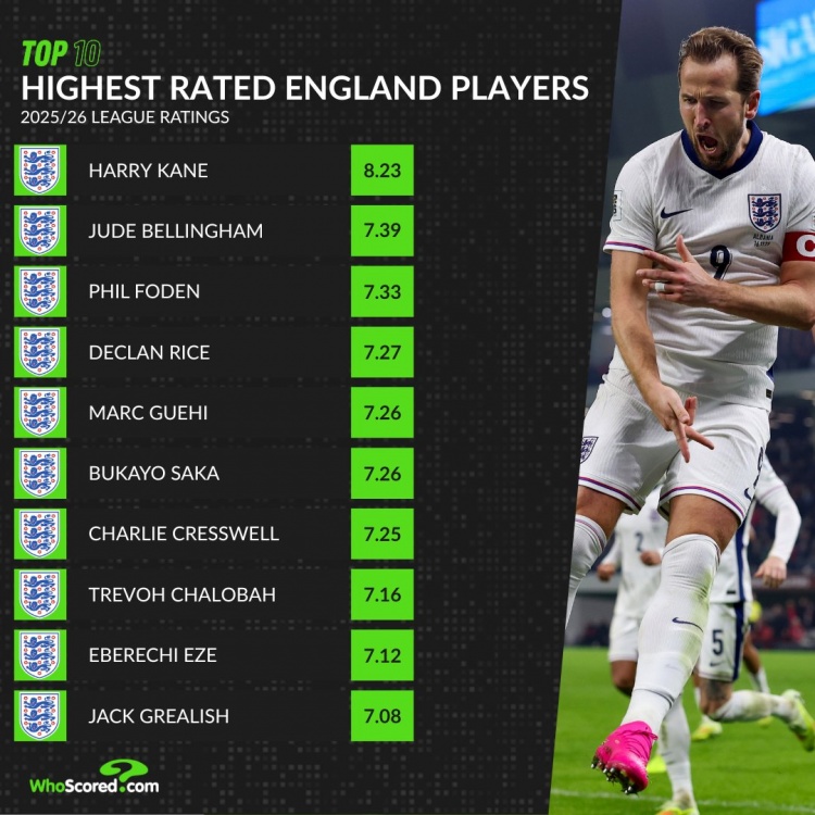本赛季英格兰球员场均评分榜:凯恩8.23分居首,