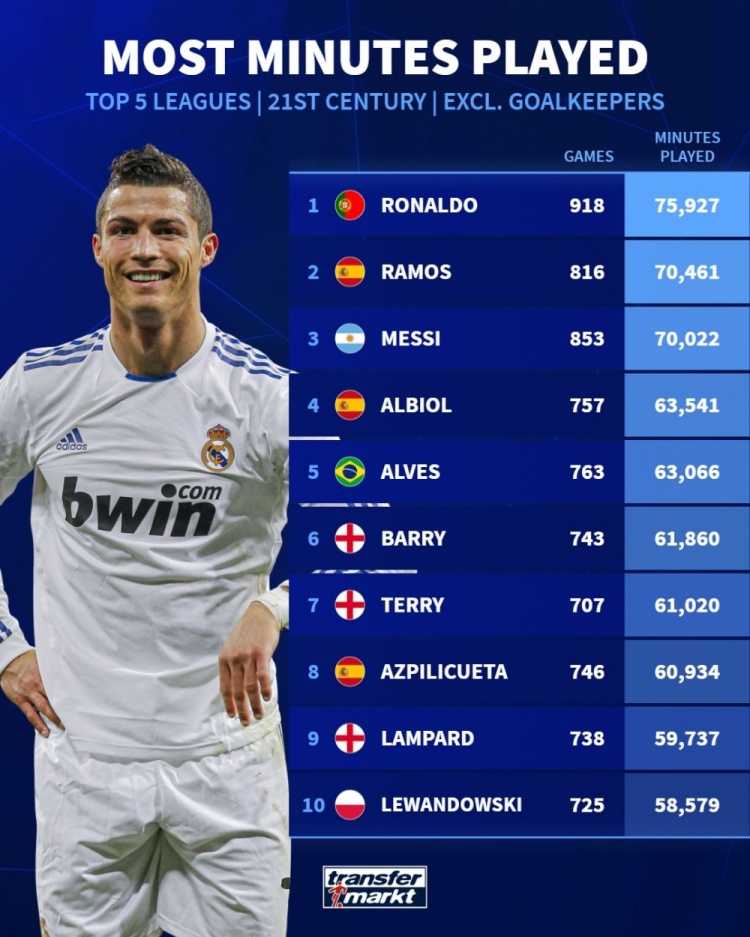 21世纪五大联赛非门将球员出场时间:C罗居首,