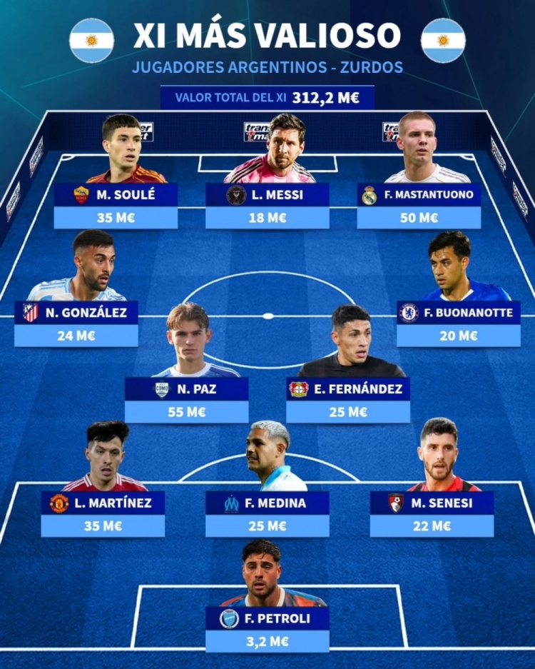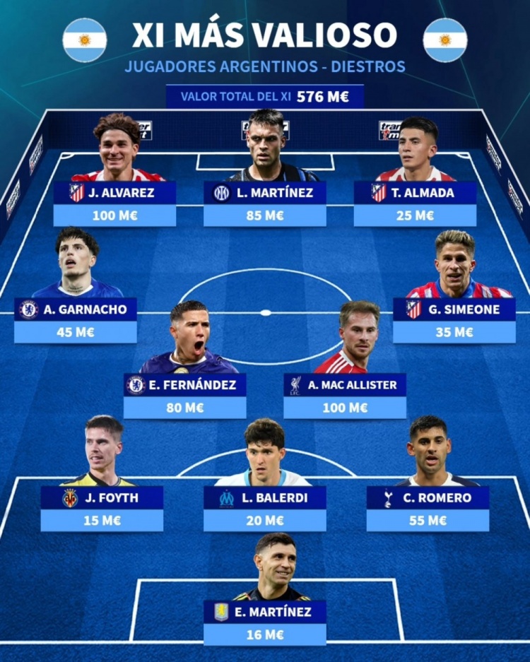 足球比分网12月5日讯 德国转会市场晒出了阿根廷右脚球员、左脚球员阵容,右脚球员阵容劳塔罗、阿尔瓦雷斯、恩佐在列,左脚球员阵容则是梅西领衔。 阿根廷右脚球员阵容: 门将:马丁内斯 后卫:福伊特、巴列尔迪、罗梅罗 中场:恩佐、麦卡利斯特、加纳乔、朱利亚诺·西蒙尼 前锋:阿尔瓦雷斯、劳塔罗、阿尔马达 阿根廷左脚球员阵容: 门将:佩特罗利 后卫:利桑德罗、梅迪纳、塞内西 中场:尼科·帕斯、埃兹奎尔、冈萨雷斯、博纳诺特 前锋:苏莱、梅西、马斯坦托诺