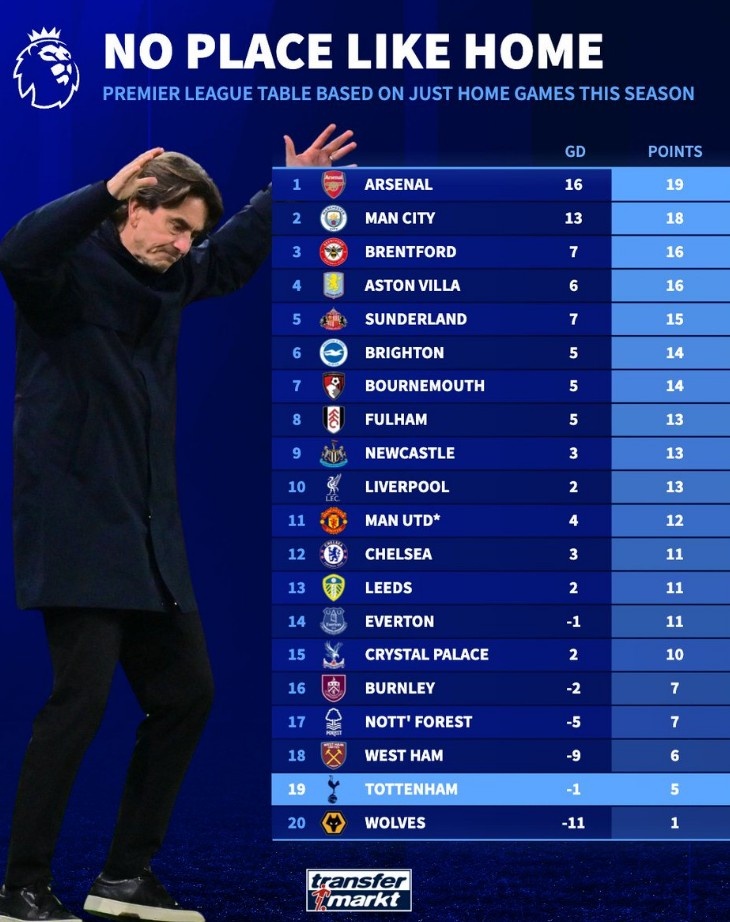 本赛季英超主场战绩榜:阿森纳积19分居首,热刺