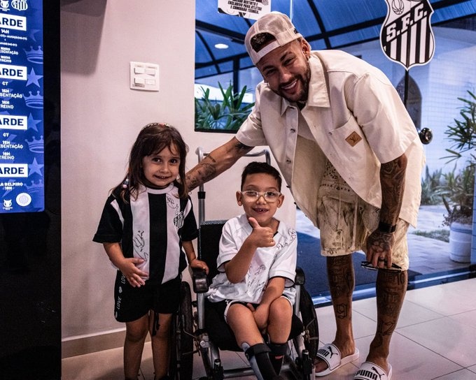 足球比分网12月6日讯 患病小球迷莱维造访桑托斯俱乐部,与偶像内马尔互动并合影。 桑托斯小球迷莱维患有先天脊髓脊膜膨出症,这是一种罕见的疾病,莱维坚强地与病魔抗争,今日他受邀参观桑托斯训练中心,与球员们见面合影,并与自己的偶像内马尔互动,桑托斯社媒晒出相关照片。