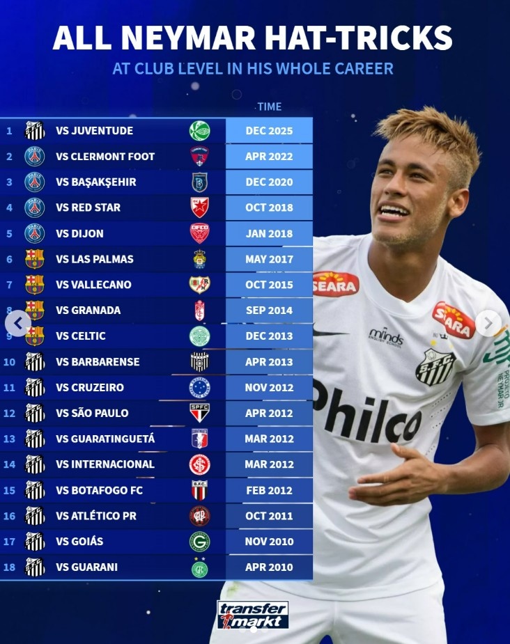 内马尔俱乐部生涯18次帽子戏法盘点:为巴萨、巴