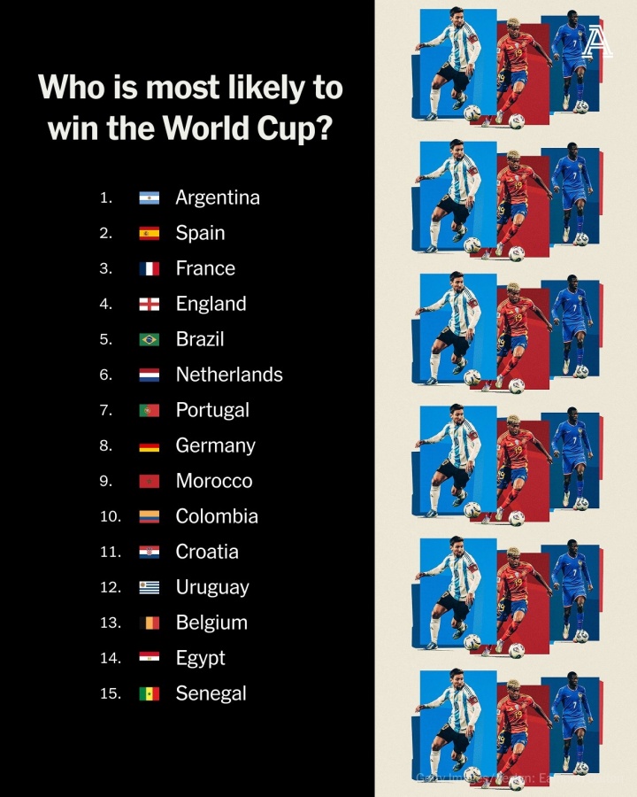 世界杯抽签仪式马上就要来了,我们真的可以开始为明年夏天的赛事感到兴奋了。 严格来说,这次抽签一共有64支球队参与:其中42支已经锁定正赛名额,另外还有16支球队在争夺欧洲区的4个席位,以及其他大洲的6支球队在为2个洲际附加赛名额展开厮杀。 现在正是时候——当整个赛事的分组即将呈现在我们眼前时,我们可以开始认真思考究竟哪支球队最有可能捧杯了。为此,我们完成了一项相当庞大的工作:把所有64支(潜在)参赛球队从第1名排到第64名,评估它们在7月19日于新泽西站上领奖台的可能性。 有些排名可能会看起来有点“奇怪”,因为某些尚未出线的球队被排在了已经出线的球队前面,但这纯粹是对球队实力的评估——现实情况就是,欧洲第17强的球队也大概率比大洋洲最强的球队更出色。 你们肯定都有自己的看法,欢迎在评论区畅所欲言!不过请把这份排名当作一场对赛事可能走向的大胆畅想,而不是什么特别严肃的预测。