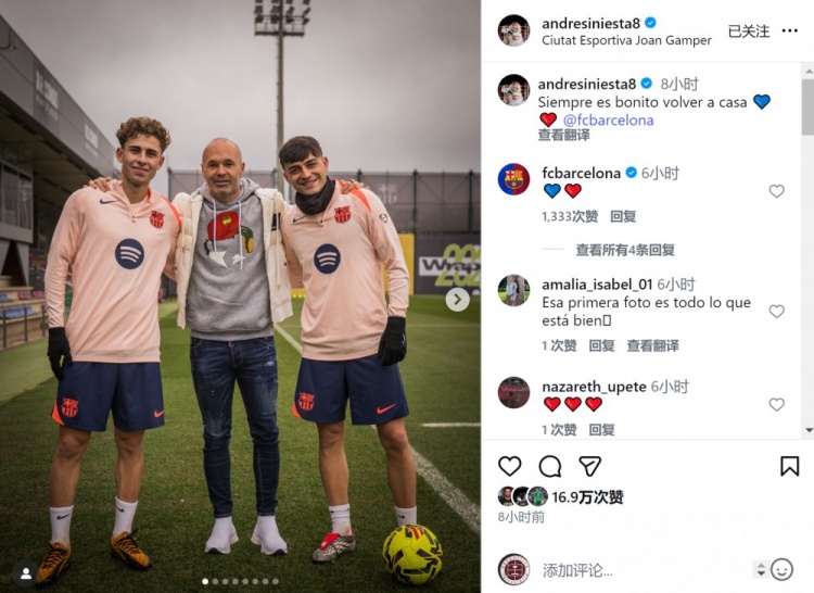 足球比分网12月6日讯 伊涅斯塔更新社媒动态,晒出造访巴萨训练基地的照片。 伊涅斯塔重返巴萨训练基地,与佩德里、费尔明、亚马尔、巴尔德、特狮等球员合影,他在社交媒体上晒出照片,配文:“回家的感觉总是很美好。”