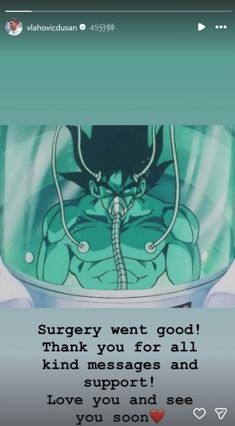 足球比分网12月5日讯 弗拉霍维奇更新社媒动态,表示自己手术成功,并感谢球迷的祝福。 弗拉霍维奇接受了左腿内收肌肌腱撕裂修复手术,他在社交媒体上晒出《七龙珠Z》悟空在治疗舱里恢复的图片,配文:“手术很成功,感谢大家所有的祝福信息和支持!爱你们,很快再见!” |