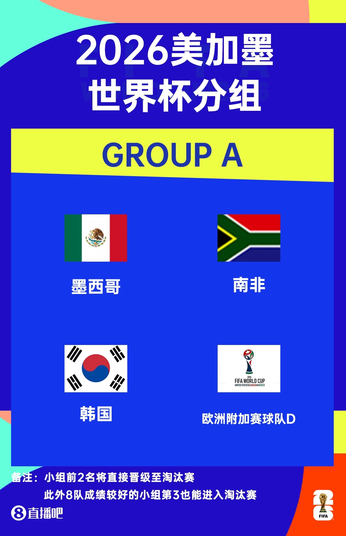 2026年美加墨世界杯小组赛抽签仪式结束,法国、塞内加尔、挪威造死亡之组!英格兰碰克罗地亚,葡萄牙遭遇哥伦比亚,荷兰遭遇日本,比利时遭遇埃及,西班牙遭遇乌拉圭,阿根廷好签。 世界杯A组:墨西哥、南非、韩国、欧洲区附加赛D
