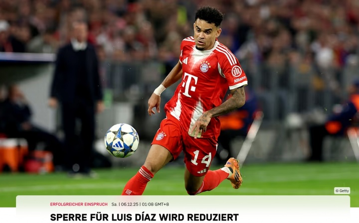 拜仁官方:迪亚斯禁赛上诉成功,欧冠禁赛由3场