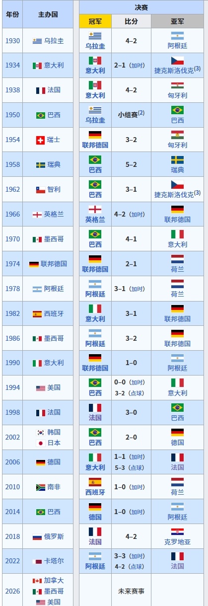 注1:1950年世界杯未举行单场的冠军决赛。而是由四支球队进行循环赛,根据各队总积分排定名次。最终乌拉圭第1,巴西第2。 注2:捷克斯洛伐克的成绩,国际足联以捷克继承之。 注3:南斯拉夫队之成绩,国际足联以塞尔维亚继承之。 注4:苏联之成绩,国际足联以俄罗斯继承之。