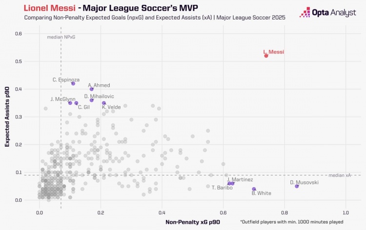 足球比分网12月5日讯 Opta晒出本赛季美职联球员进攻威胁散点图,梅西独一档, Opta统计了本赛季球员在美职联的每90分钟非点球预期进球、每90分钟预期助攻,并以散点图的形式呈现,梅西独自处于散点图右上角,他的每90分钟非点球预期进球超过0.7粒,预期助攻超过0.5次。 |