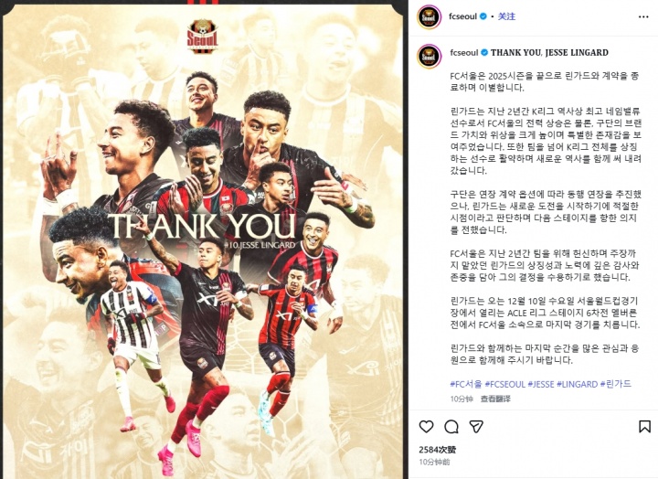 足球比分网12月05日讯 首尔FC官方宣布,32岁的攻击手林加德将在赛季结束后离开球队。 官方公告: 首尔FC宣布,2025赛季结束后与林加德合同结束,正式分道扬镳。 过去两个赛季里,林加德作为K联赛历史上商业价值顶级的球员,不仅助力首尔提升了球队战力,还极大地提升了俱乐部的品牌价值与行业地位,展现出了独一无二的影响力。此外,他的作用还超越了球队范畴,成为了整个K联赛的标志性球员,携手联赛共同书写了崭新的历史。 俱乐部曾依据续约条款推进续约事宜,但林加德认为当下是开启新挑战的恰当时机,并表达了奔赴下一段职业生涯的决心。过去两年间林加德为球队倾尽全力,肩负起队长重任,他所具备的标杆意义与付出的努力,俱乐部致以深切的谢意与敬意,最终决定尊重并接受他的选择。 12月10日周三于首尔世界杯体育场打响的亚冠精英联赛小组赛第6轮,林加德将以首尔FC球员的身份,在对阵墨尔本的比赛中,完成自己的告别之战。期待广大球迷能以高度的关注与热情的应援,陪伴林加德踢完这最后一场比赛。 现年32岁的林加德在2023年夏天离开诺丁汉森林,2024年初以自由球员的身份加盟首尔FC俱乐部,效力球队近两年,林加德代表首尔已经出战了66场,贡献18球10助攻。 林加德出自曼联青训,职业生涯租借效力过莱斯特城、伯明翰、布莱顿、德比郡、西汉姆联等球队。 |
