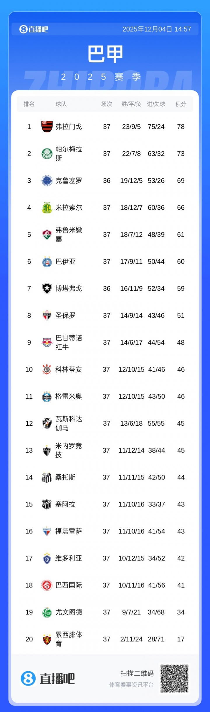 降级5选2!巴甲积分榜:内马尔所在的桑托斯排第