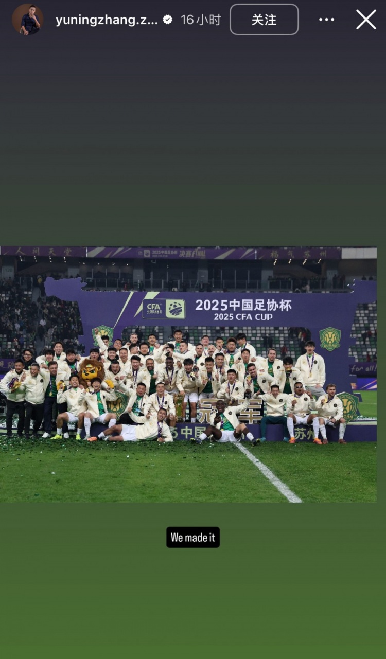 足球比分网12月7日讯 2025赛季足协杯决赛于昨晚落下帷幕,最终北京国安3-0击败河南队,队史第5次捧得足协杯冠军。 赛后国安前锋张玉宁在个人ins上发出多张赛后全队拍夺冠大合影的动态,并配文写道:“朋友们,我们是冠军!”“我们做到了!”