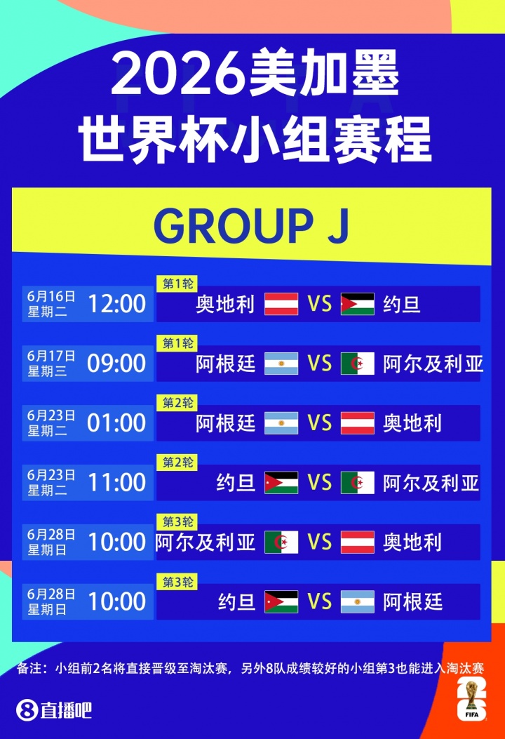 2026美加墨世界杯赛程正式公布,揭幕战将在6月12日凌晨3点打响,各组对阵时间也全部出炉,来看看你关注的队伍几时开战! 世界杯J组赛程:阿根廷首战vs阿尔及利亚,6月17日9点