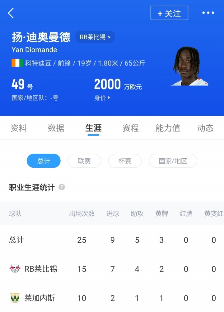 要9000万欧!19岁迪奥曼德戴帽+赛季7球4助,莱比