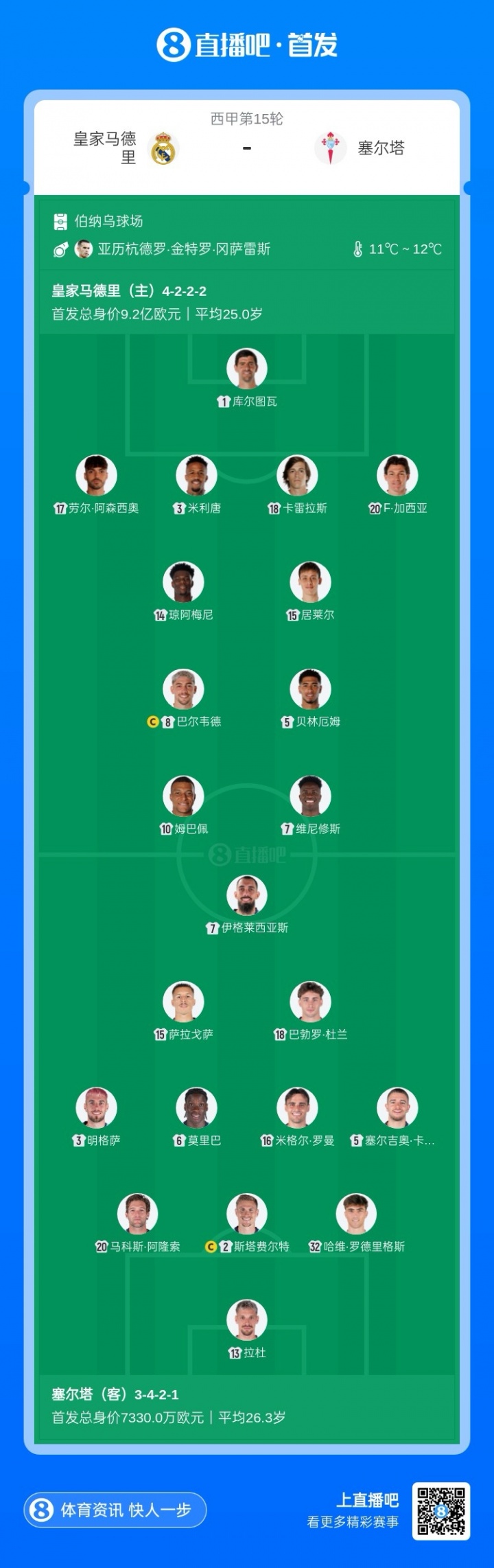 皇马vs塞尔塔首发:姆巴佩、维尼修斯、居莱尔出
