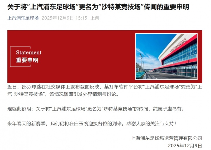 足球比分网12月10日讯 上汽浦东足球场官方微信公众号发布申明,就网传球场更名一事做出澄清。 关于将“上汽浦东足球场”更名为“沙特某竞技场”传闻的重要申明 近日,部分球迷在社交媒体上发布截图反映,某打车软件平台将“上汽浦东足球场”变更为“上汽-沙特某竞技场”。该情况随即引发外界猜测与讨论。 现就此说明:关于将“上汽浦东足球场”更名为“沙特某竞技场”的传闻,纯属子虚乌有。 来年春天的新赛季,我们仍将在白玉碗迎接各位的到来。感谢大家的关注与支持! 上海浦东足球场运营管理有限公司 2025年12月9日