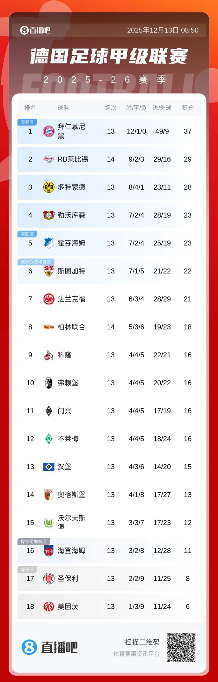 足球比分网12月13日讯 德甲第14轮先赛一场,排名第2的莱比锡1-3不敌柏林联合,仍距离榜首拜仁8分。 莱比锡近5轮丢了7分,但他们一直排在德甲第2的位置,只是与榜首拜仁的差距越来越大。 多特蒙德在莱比锡输球后,终于有望在本轮反超莱比锡升至第2。拜仁则有希望继续扩大与德甲第2的积分差距。若是多特本轮不胜,拜仁赢球后甚至可以将积分优势扩大到11分。即便多特赢球,拜仁本轮拿下3分也可以将8分优势变成9分优势。