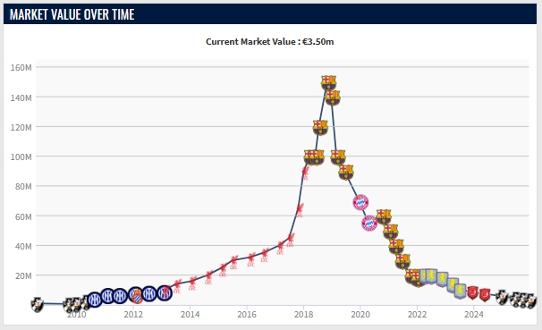新低!33岁库蒂尼奥巅峰身价1.5亿如今仅剩350万欧