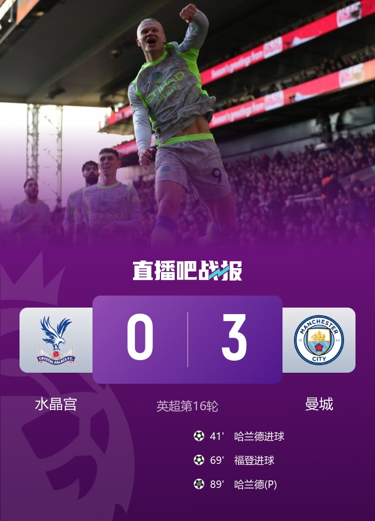 英超联赛第16轮,哈兰德梅开二度,福登进球,曼城客场3-0战胜水晶宫。 四连胜遭终结!拜仁2-2美因茨9分领跑 17岁卡尔连场破门凯恩点射