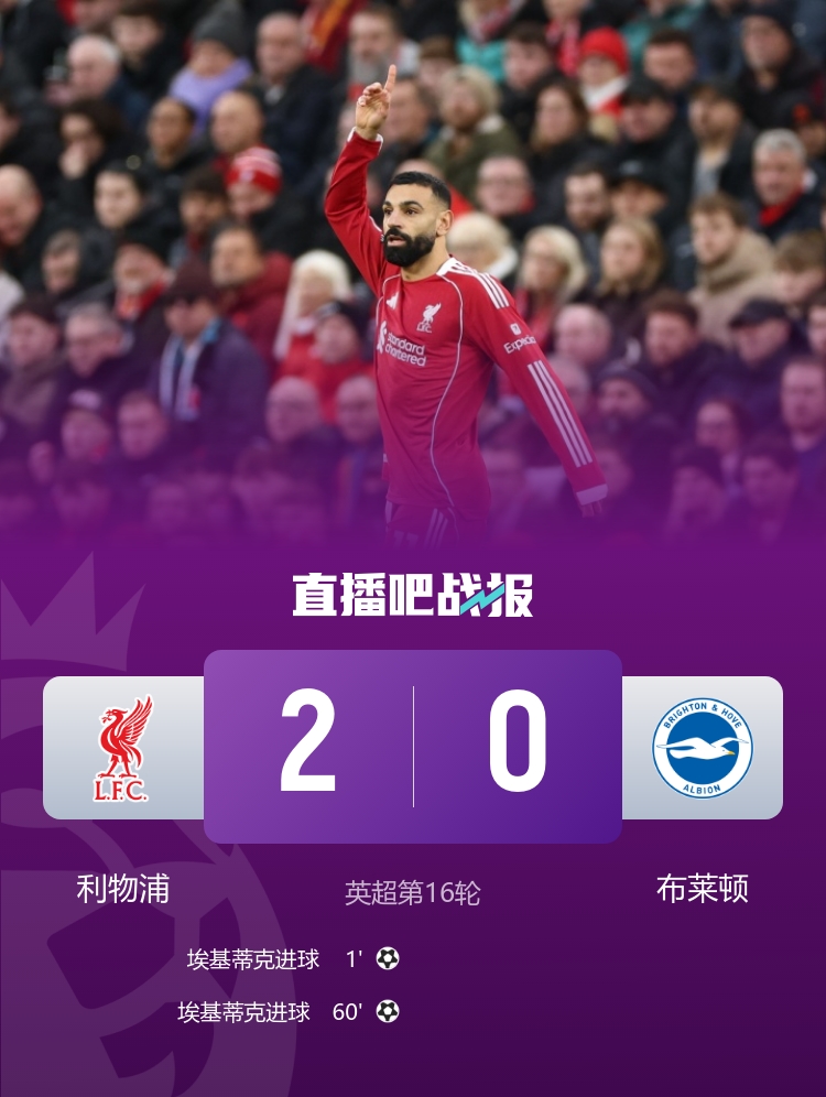 埃基蒂克梅开二度,萨拉赫助攻,利物浦2-0布莱顿。 官方:迭戈·戈麦斯对维尔茨的犯规未使用过度力量,不是严重犯规 萨拉赫英超单一俱乐部直接参与277球,超鲁尼成历史第一 各赛事五连胜!巴萨2-0奥萨苏纳先赛7分领跑 拉菲尼亚双响
