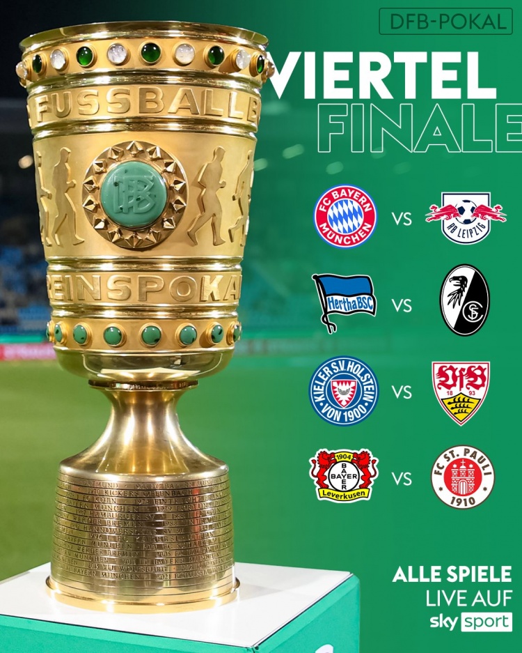 足球比分网12月8日讯 德国杯1/4决赛抽签结果出炉,拜仁将和莱比锡交手,这会是本赛季德国杯的焦点对决。 以下为具体抽签结果: 拜仁VS莱比锡 柏林赫塔VS弗赖堡 荷尔斯泰因基尔VS斯...