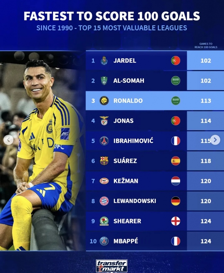足球比分网10月26日讯 德国转会市场列出了1990年以来为单支球队攻入100球所需最少场次排名,C罗仅用113场就达成利雅得胜利100球里程碑,排名第三位。 1990年以来为单支球队打进百球所...