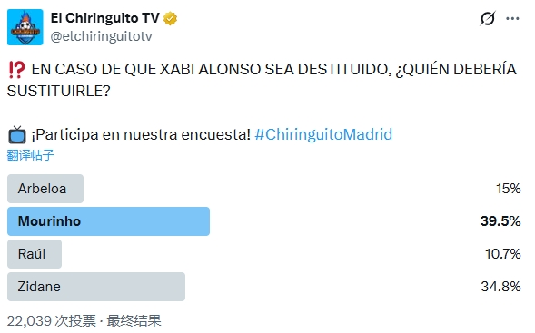 足球比分网12月08日讯 西班牙六台发起投票,询问若是阿隆索下课,谁应该接任。 四个选项中,穆里尼奥的得票最多,齐达内第二,阿韦洛亚第三、劳尔第四。 得票率: 穆里尼奥39.5...