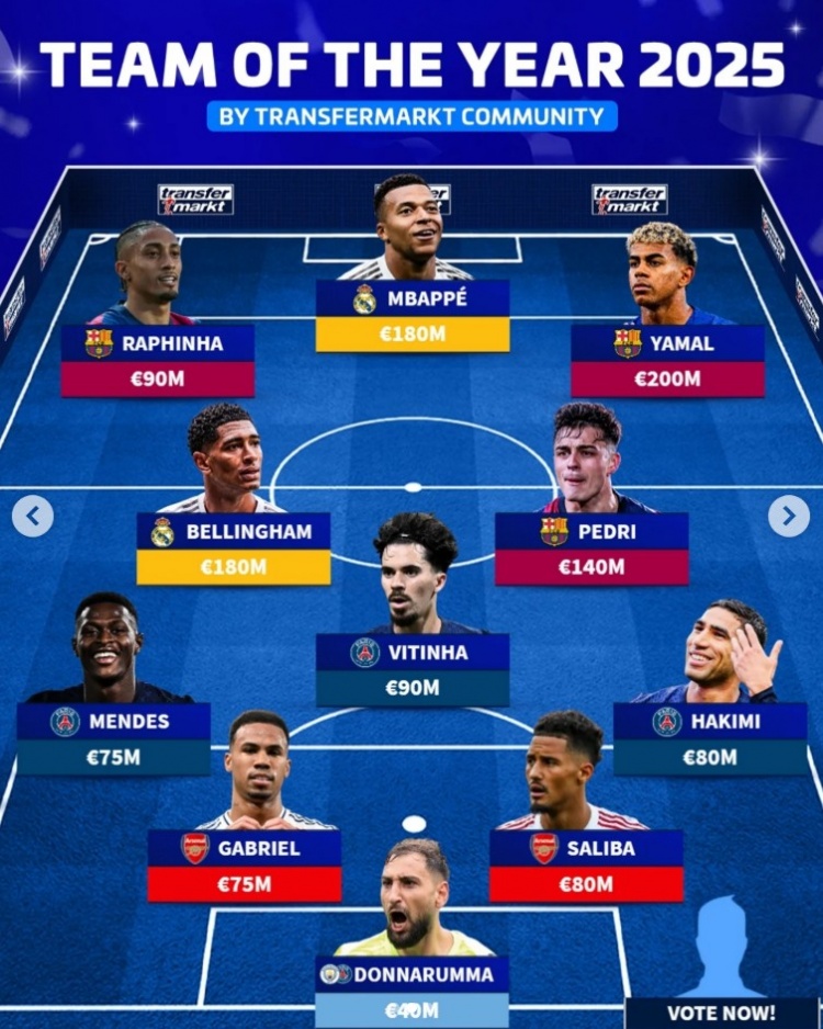 足球比分网12月6日讯 德转此前发起2025年度最佳阵容投票,目前11人球员最佳阵已经出炉,只剩最佳主帅尚空缺,以下为最佳阵容情况: 门将:多纳鲁马(曼城、巴黎) 后卫:努诺·门...