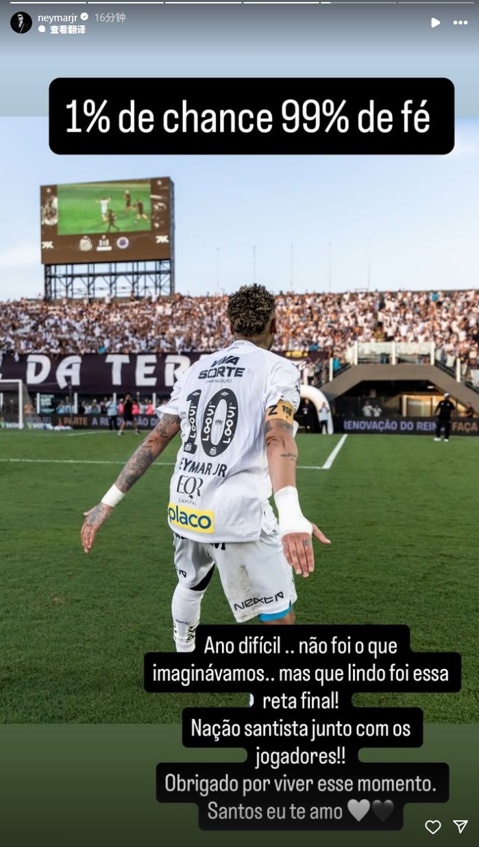 足球比分网12月8日讯 内马尔今天在Instagram发文,庆祝桑托斯巴甲末轮取胜+成功保级。 内马尔写道:“1%的机会,99%的信念。” “艰难的一年……并非我们想象中的那样……但最后阶段...