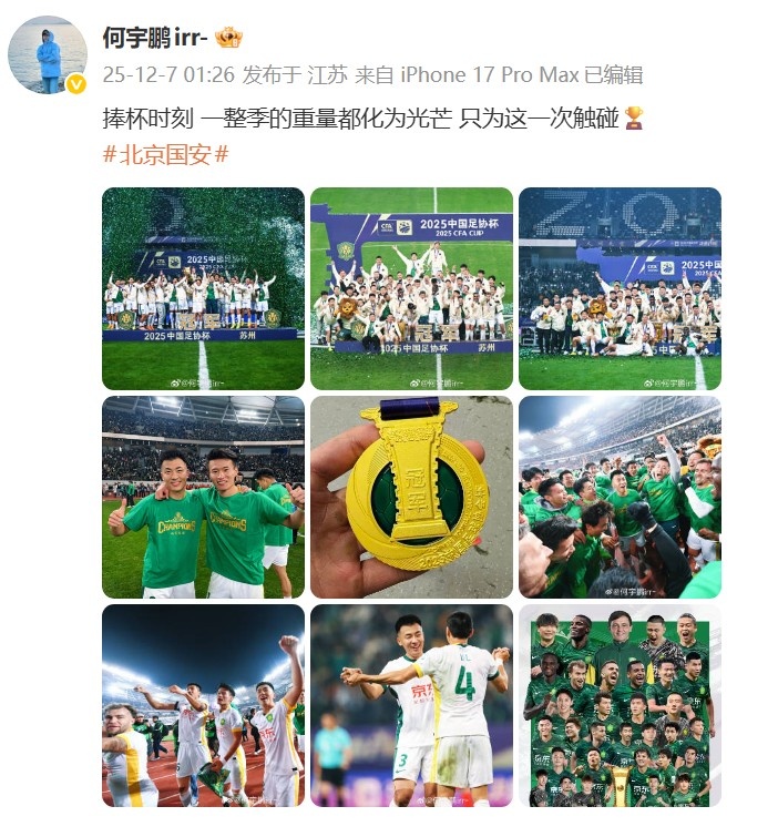 足球比分网12月7日讯 2025中国足协杯决赛,北京国安3-0战胜河南俱乐部酒祖杜康,夺得冠军。 球员何宇鹏社媒发布多张照片庆祝夺冠,配文:捧杯时刻,一整季的重量都化为光芒,只为...