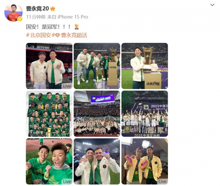足球比分网12月7日讯 2025中国足协杯决赛,北京国安战胜河南俱乐部酒祖杜康,夺得冠军。 球员曹永竞社媒发布多张现场照片庆祝夺冠,配文:国安!是冠军!!!...